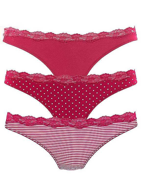 Crafted from a soft cotton stretch quality, these thongs offer a luxurious feel against the skin. The delicate lace detailing at the waistband adds a touch of femininity to the design, making you feel confident and alluring. Featuring a mix of allover printed and plain designs, this pack offers versatility for your everyday wardrobe. Express your personality with the fun and playful prints, or keep it simple with the classic and elegant plain options. With a variety of stripes, prints, and solid colours, there is something for every mood and occasion. Designed to provide a seamless fit, our thongs are perfect for wearing under any outfit. The minimal coverage ensures no visible panty lines, giving you a smooth silhouette. The thong style also offers a flattering and comfortable fit, making it a must-have in your lingerie collection.Brand: LASCANAPack of 3With delicate lace at the waistbandAllover printed and plain in one packMade from soft cotton stretch qualityMachine wash95% Cotton, 5% Elastane. Lace: 87% Polyamide, 13% Elastane
