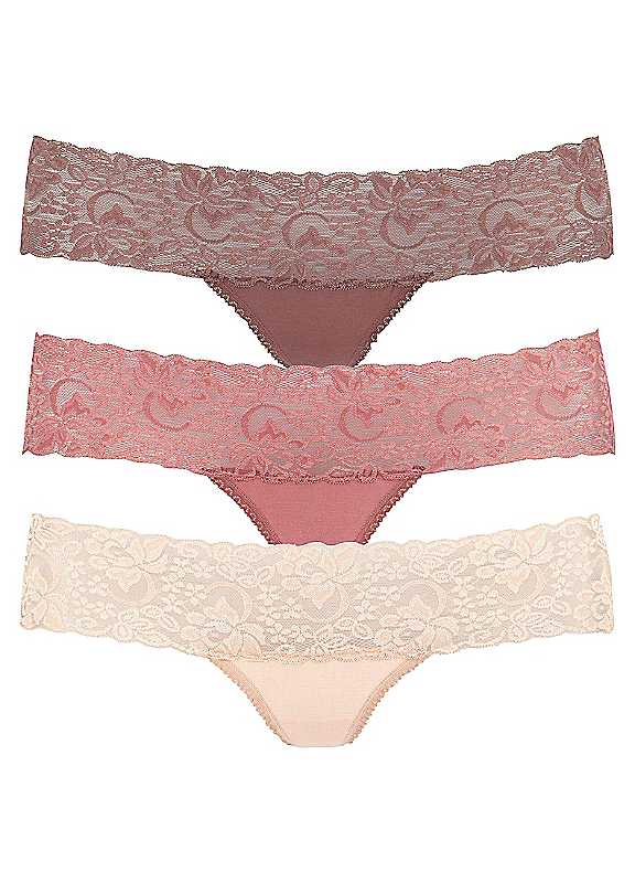 Comfortable pack of 3 thongs with a wide lace band.Brand: LASCANAPack of 3Wide, elasticated lace waistbandSoft edging at the leg openingComfortable stretch cottonMachine washableShell: 95% Cotton, 5% Elastane. Lace: 93% Polyamide, 7% ElastaneBy purchasing these products you are supporting the sustainable farming of cotton as part of the 'Cotton Made in Africa' initiative and contributing towards the improvement of living conditions for cotton farmers in Africa.