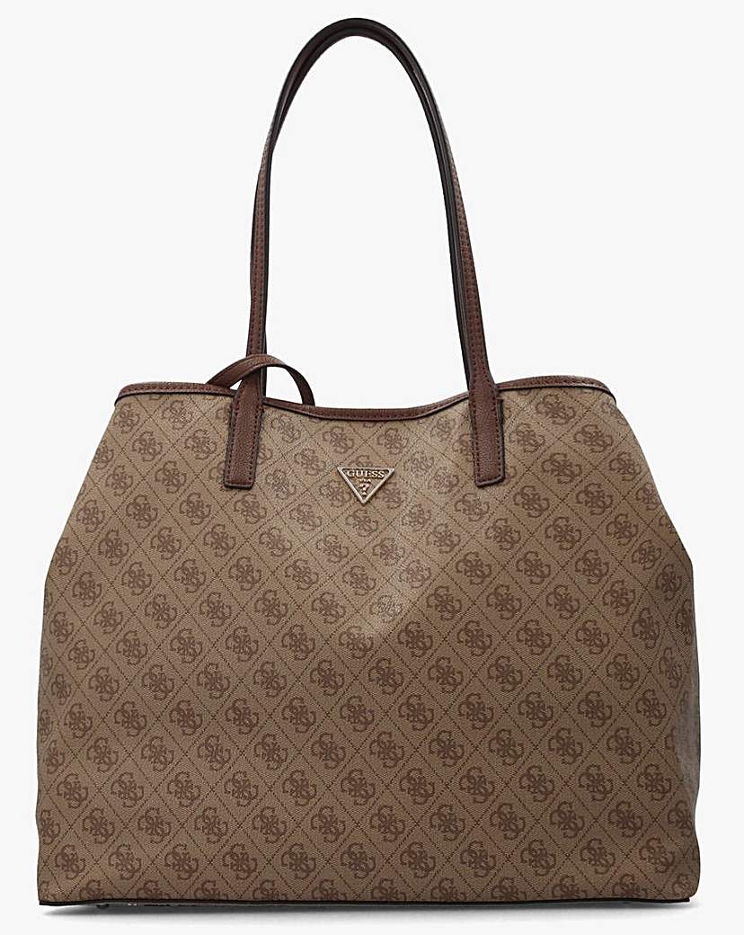 Guess Victtoria II Latte Logo 2 In 1 Tote Bag The Guess Victtoria II Latte Logo 2 In 1 Tote Bag is part of the New Season collection. This everyday slouchy style is a textured monogram design with polished gold tone accents. The secure magnetic snap closure allows access to the spacious main compartment with handy inner slot pockets. Additional detachable inner pochette features. Carry by the top handles on the shoulder or by hand. Classic triangular Guess logo motif adds detail; further signature Guess branding completes the design. Technical information: Textured Design, Gold Tone Hardware, Magnetic Snap Fastening, Single Compartment, Inner Slot Pockets, Detachable Inner Pochette, Contains Recycled Plastic, Top Handles, Guess Triangle Logo Motif, Guess Branding Main Bag Dimensions: L40 x H34 x D20 CM Pochette Bag Dimensions: L26 x H19 x D6 CM