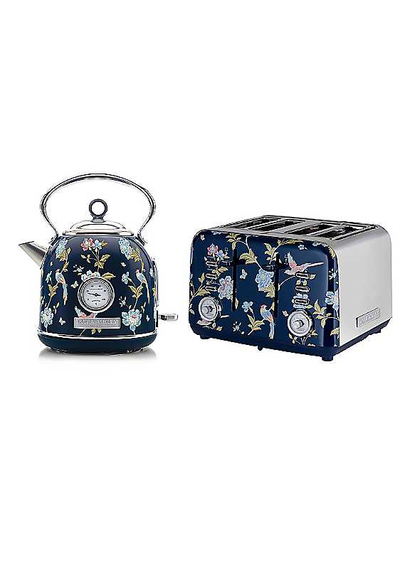 Radiating with timeless grace, the Laura Ashley kitchen set. Each set is hand-decorated and finished with a high-grade gloss UV coating to ensure it looks pristine day in, day out.Kettle: The chrome handle is more than just a touch of elegance: it offers a sturdy and reliable grip. This kettle, adorned in a harmonious blend of iconic and modern prints, transforms an everyday appliance into a statement piece of art. The rapid-boil electric kettle has several safety functions. It has a boil-dry feature that automatically shuts down the power if no water is inside and overheat protection with a concealed heating element.Toaster: This 4-slice toaster has all the features needed to create the perfect breakfast for your friends and family. Made with high-grade durable stainless steel, it is built to last and easy to keep clean in the kitchen. An auto-centring feature to evenly toast on all sides, no matter how thick or thin. You can even warm up croissants on the warming rack included for that delicious continental-style breakfast.Capacity approx. 1.7 LitreOverheat protectionLimescale filter7 heat setting toasterRemovable crumb trayWarming rack