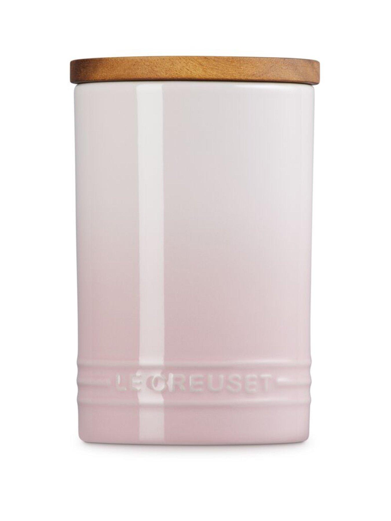 Le Creuset Le Creuset Stoneware Signature Storage Jar 770ml Shell Pink Introducing the Signature Storage Jar with Wooden Lid, a must-have kitchen essential providing the perfect way to store and keep ingredients fresh and to add colour on your kitchen shelves. A silicone seal on the lid keeps the Signature Storage Jar air tight. Made from specialist clays and fired at the highest temperatures, all Le Creuset stoneware is strong and durable. Thanks to Le Creuset's enamelling expertise Le Creuset stoneware is also easy to clean and scratch resistant. Available in a wide range of vibrant colours. Covered by a Le Creuset 10 year guarantee. Height: 16.4 CM