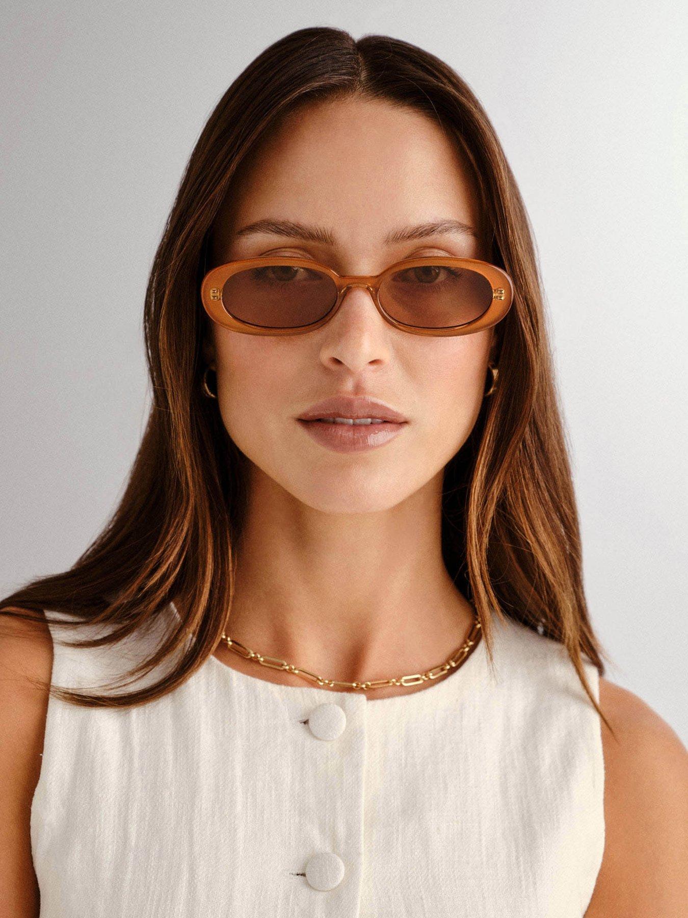 Exuding '90s confidence, Le Specs' iconic OUTTA LOVE silhouette offers a minimal nineties look. Details Outta Love Caramel Sunglass by LE SPECS Brown This petite, slimline oval silhouette features a modern flat profile and signature Le Specs gold metal hardware, and is just the right size to complement your face without hiding your best features. Designed for a smaller, more petite fit, perfect for those with narrower face shapes. Finished in a caramel frame with tan tint lenses. A lightweight, durable and impact resistant polycarbonate frame. Fitted with shatterproof and scratch resistant polycarbonate lenses. Worn by Bella Hadid, Gigi Hadid, Sophie Turner, Dua Lipa, Kourtney Kardashian, Olivia Rodrigo, Kesha, Zoe Kravitz. Material & Care Material Content: T110 - ECOZEN T110 10% Plant Biomass Washing Instructions: Wipe Clean