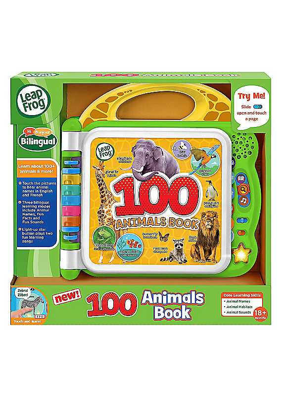 Discover new vocabulary with Learning Friends! Featuring fun pictures, music and engaging sounds. Each page features different categories. Touch words on each page to hear the animals from each of the 6 habitats along with exciting sound effects. Slide the language switch between English and French to hear all the content in either language. Brand: Leapfrog Suitable for children aged 18+ months Learning Friends 100 Animals book Fun pictures, music & sounds Switch between English and French words Requires 2x AA batteries (included) Size approx. 4.8 x 23.9 x 23.5 cm (2 x 9½ x 9¼ in)