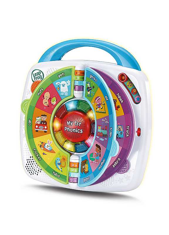 Little ones will delight in learning 44 phonemes in the English language with the My 1st Phonics: Spin & Learn. 5 double sided flip pages feature colourful images and over 100 words chosen specifically to help toddlers have fun learning language sounds. Kids can press the 10 light up buttons to explore each picture, learning the word, and highlighted letter sound or they can press the big red button in the middle to see the lights swirl around for random learning. Four learning modes let toddlers explore the 44 sounds of English, practise with fun phrases, and hear sounds blend into words. In Fun Sounds mode, they get to match delightful sound effects with pictures. Brand: LeapFrog Age suitability: 18+ months Learn 44 phonemes in the English Language with My 1st Phonics: Spin & Lear Discover language sounds on the 5 double sided flip pages & colourful images Press the 10 light up buttons to explore each picture, learning the word & highlighted letter sound Push the big red button in the centre to randomise learning Four modes enable kids to practise with fun phrases, hear sounds in blend mode & fun sounds