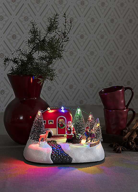 Illuminated resin scene depicting Santa in front of a caravan about to deliver gifts to some excited children waiting patiently by a tree. This is truly a scene capturing the spirit of Christmas, snow, Santa and a sack of presents! This scene stands 10.5cm tall by 18.5cm wide, is powered by 3 x AA battery (not included) and has 6 brightly coloured LED.6 x LEDsSuitable for indoor useSpecifications material: PolyresinDimensions approx. 10.5 x 18.5 x 13 cmPlease note: The images of the products on our website are for illustrative purposes. We endeavour to display as accurately as possible the colours of our products on our website, however, as different computers and mobile devices display colour tones differently we cannot guarantee the complete accuracy of the pictures or photographs that are shown | led lights christmas, christmas decor, xmas decorations