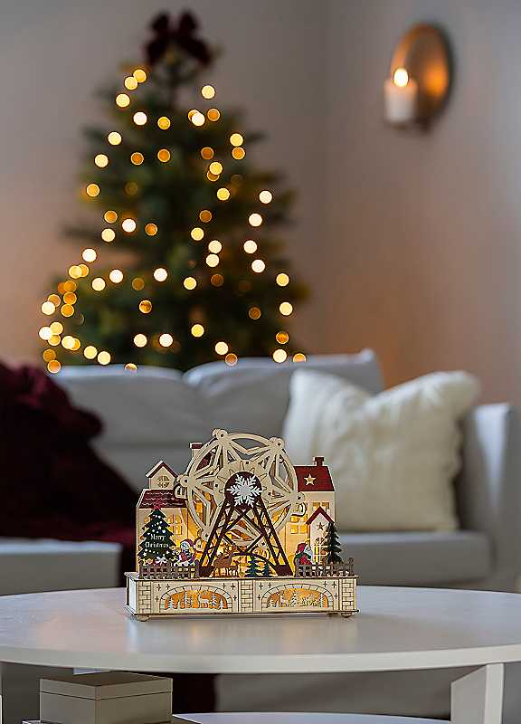 Imagine you are at a Christmas Fairground, imagine no more. Look at this intricately cut indoor wooden silhouette with a working Ferris Wheel in between Santa and a Snowman and reindeer in the foreground. Illuminated by 10 high power warm white LED, this scene can be powered by battery (3 x AA not included) or mains using the 1.8m USB lead supplied.Requires 3 x AA batteries (not included) or mains powered (USB lead included)Dimensions approx. 24.5H x 28W x 12D cm | lit christmas decor, led ornament lights, wooden christmas ornaments, lighted christmas ornaments, wooden christmas decorations