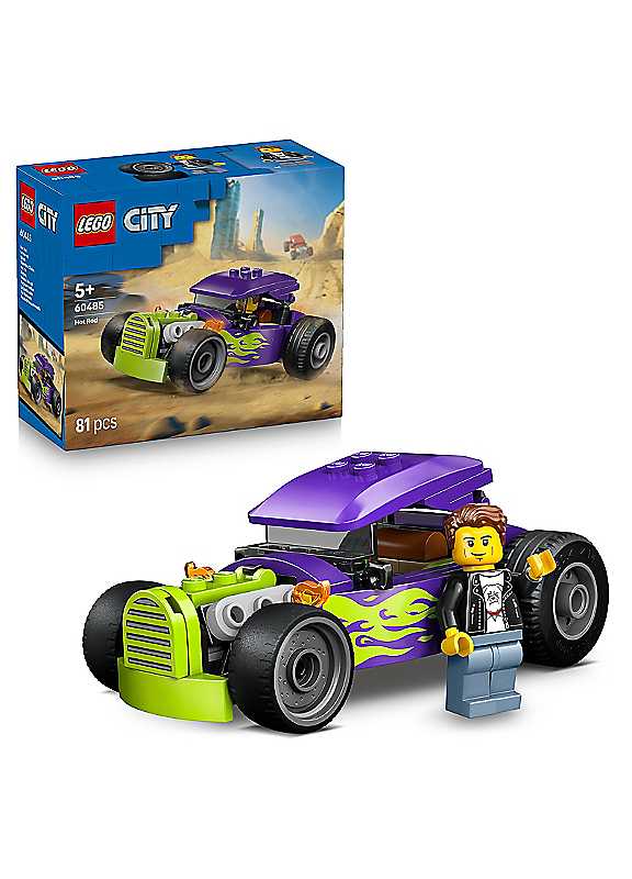 young race car lovers aged 5 and over can buckle up for high-speed drag racing action with the LEGO City Hot Rod car toy (60485). This model car building kit packs big thrills with detailed racing features including oversized rear tyres, a driver cockpit with a lift-up roof, and a cool purple colour scheme with neon green flames. Just add the driver minifigure for fast-paced pretend play.This small playset makes a great birthday gift or surprise treat for kids, boys and girls who love classic toy cars, building and imaginative storytelling. Add this set to others (sold separately) from the LEGO City range for more exciting race action. With this LEGO hot rod playset, kids can enjoy intuitive building with the LEGO Builder app, zooming and rotating with 3D instructions, while saving and tracking progress. Set contains 81 pieces.Check out the 3D building instructions in the LEGO Builder app.Add this racing car toy to other sets (sold separately) in the LEGO City range.The kids' car toy in this 64-piece building set is over 12 cm (4.5 in.) long.Age suitability: 5+ yearsLEGO City Hot Rod race car toy playset for kids aged 5 & overClassic hot rod vehicle toy with oversized rear tyres & a driver minifigureLift the roof & seat the driver minifigure for high-speed playMake the creative experience extra fun with the LEGO Builder appA fun birthday or anytime gift for 5-year-old boys, girls & fans of toy carsWARNING! Choking hazard. Small parts.
