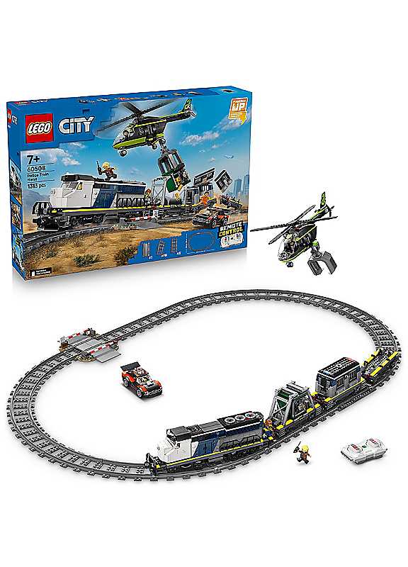 All aboard for nonstop action with the LEGO City Police Train Heist (60508) toy for boys and girls aged 7 and up.This Powered Up electric train set for kids includes a working locomotive and 3 flat wagons carrying a prison cell, bank safe, and rally car toy.The building set also includes an oval train track with a railroad crossing and a track piece for re-railing trains.Just add the model helicopter toy with a working grabber claw and the detective, police officer, train driver, and 3 crook LEGO minifigures for imaginative train heist adventures.This toy train set makes a great surprise treat or birthday gift for boys and girls aged 7 and up who love model trains and LEGO building kits.Add this set to others (sold separately) from the LEGO City range for more exciting adventures.With this LEGO City Police train toy, kids can enjoy intuitive construction in the LEGO Builder app, zooming and rotating with 3D instructions, saving, and tracking progress. Age suitability: 7+ years POLICE TOY TRAIN SET - The LEGO City Police Train Heist model kit features a motorised train toy for 7+ year old boys and girls, plus a helicopter, rally car, circular track and 6 minifigures WHAT'S IN THE BOX? - This toy train set includes all kids need to build a Powered Up locomotive, 3 flat wagons, a rally car toy, helicopter, prison cell, bank safe and railroad crossing FUN FEATURES FOR ROLE PLAY - Functions include a crook's helicopter toy with a grabbing claw for heisting the bank safe, a rally car and a prison cell from the police train model REMOTE CONTROL TRAIN SET - Comes with an oval train track and a motorised police locomotive that can be controlled via the included remote or a smart device with the Powered Up app BIRTHDAY GIFT FOR KIDS AND COLLECTORS - This police train playset makes a fun birthday gift for 7+ year old boys, girls and adult LEGO collectors who love police toys and toy model train sets WARNING! Choking hazard. Small parts.