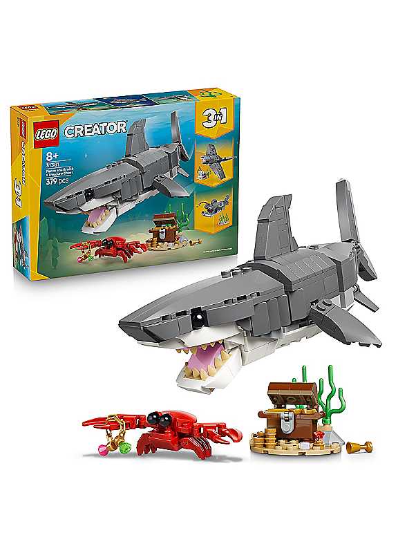 Kids can play out fun underwater stories with this LEGO Creator 3-in-1 Fierce Shark with a Treasure Chest (31381) building toy for 8+ year old boys and girls. This impressive sea animal toy set offers kids 3 different building options with the same set of LEGO bricks. They can choose to build a posable shark toy that can be displayed on a stand with a treasure chest and crab. They can then rebuild it into an anglerfish on a stand with sea plants or a posable manta ray sea animal figure on a stand with a clamshell. Once the building and playtime fun is over, each model can be displayed as room decor on a shelf or desk.This LEGO Creator 3-in-1 set will inspire young imaginations and makes a great birthday gift for 8+ year old boys and girls who love toy sea animals. And with the LEGO Builder app, they can also experience a building adventure. They can zoom in and rotate their sets using 3D building instructions, track their progress and save sets in one place. Please note models cannot be built simultaneously.MORE CREATIVE FUN - Enjoy even more building adventures with other sets (sold separately) from the extensive LEGO Creator 3-in-1 range.Age suitability: 8+ years3-in-1 SEA ANIMAL TOYS - The LEGO Creator Fierce Shark with a Treasure Chest toy for 8+ year old girls & boys lets kids build & rebuild 3 ocean animal figures with the same LEGO bricksENDLESS PRETEND-PLAY OPTIONS - Kids can enjoy fun stories with 3 sea creatures (models cannot be built simultaneously): a shark figure with a treasure chest, or an anglerfish or manta rayKIDS' CRAFTS WITH FUN FEATURES - The shark toy has a posable mouth, body, side fins & tail fin; the anglerfish can move its mouth, side fins & tail fin; & the manta ray has a posable tail finSTANDS WITH ACCESSORIES FOR DISPLAY - All 3 models can be displayed on a stand, plus the shark comes with a treasure chest & crab, the anglerfish comes with sea plants & the manta ray with a clamshellGIFT IDEA FOR KIDS - This LEGO Creator 3-in-1 set makes a fun anytime treat & a great birthday gift for 8+ year old boys & girls who love creative toys.WARNING! Choking hazard. Small parts. | lego puzzle, puzzle toy, animal puzzles