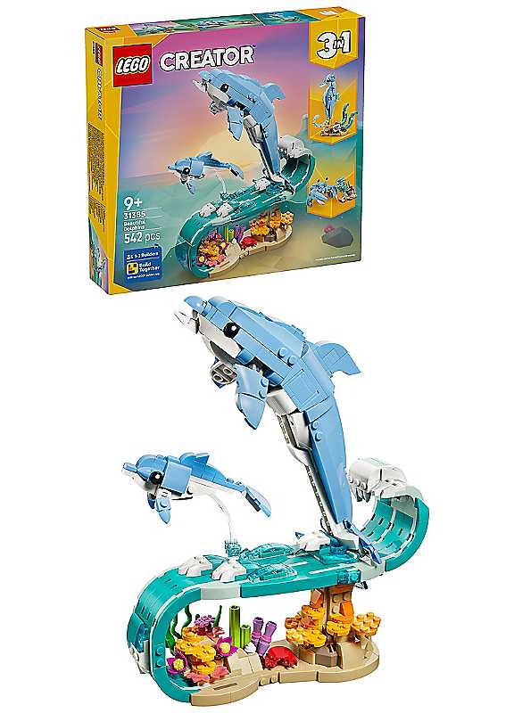 LEGO Creator 3-in-1 Sea Animals: Beautiful Dolphins (31385) building toy for 9+ year old girls and boys lets kids play out fun-filled stories. This sea animal figures playset offers 3 different building options with the same set of LEGO bricks. They can choose to build a dynamic model showing an adult and baby dolphin toy with posable features riding a cresting wave above coral. This can then be rebuilt into a posable seahorse on a colourful stand featuring seaweed and a posable clam, or a crab toy next to sea plants and a jellyfish. Once playtime is over, each sea animal figure can be proudly displayed as eye-catching nature decor on a shelf or desk.This LEGO Creator 3-in-1 set will inspire young imaginations and makes a great birthday gift for 9+ year old girls and boys who love sea animals. They can build each playset with confidence using the LEGO Builder app - zoom, rotate in 3D and track progress with easy-to-follow digital instructions. Please note models cannot be built simultaneously.MORE CREATIVE FUN - Enjoy even more building adventures with other sets (sold separately) from the extensive LEGO Creator 3-in-1 range.Age suitability: 9+ years3-in-1 ANIMAL FIGURES - The LEGO Creator Sea Animals: Beautiful Dolphins toy for 9+ year old girls & boys lets kids build & rebuild 3 sea animals with the same LEGO bricksENDLESS PRETEND-PLAY OPTIONS - Kids can enjoy fun stories with 3 animal toys (models cannot be built simultaneously): 2 dolphins riding a wave, a seahorse model or a crabKIDS' CRAFTS WITH FUN FEATURES - The adult & baby toy dolphins have posable fins & tails, the seahorse has a posable head & tail, & the crab has posable eyes & claws.FOR PLAY & DISPLAY - The building set includes coral & a cresting wave for the dolphins to ride, the seahorse has a stand with seaweed & a clam, & the crab comes with a jellyfish & sea plantsGIFT FOR KIDS - This LEGO Creator 3-in-1 set makes a great birthday gift for 9+ year old girls & boys who love animals, creative toys & imaginative play.A HELPING H& - The LEGO Builder app guides kids on an intuitive adventure where they can save sets, track progress & zoom in & rotate models using 3D instructions as they buildWARNING! Choking hazard. Small parts.