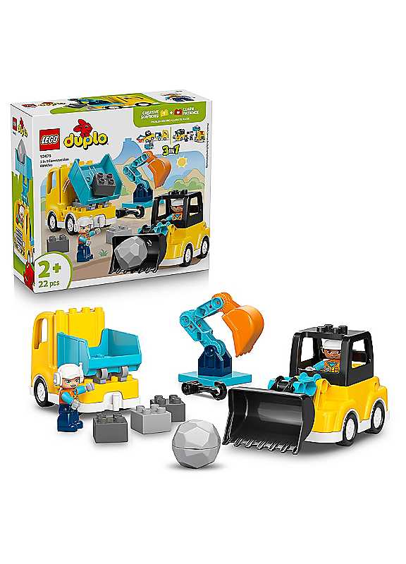 Rev up your little one's creativity with the LEGO DUPLO Town 3-in-1 Construction Vehicles (10475) learning toy for 2+ year old boys and girls. Playtimes are filled with rebuilding fun as toddlers use their focus to create 6 different truck toy building options. This LEGO DUPLO construction set's 22 bricks make 3 pairs of toy trucks: a loader with a tipping bucket that fills the dumper truck with bricks, a digger toy and a tow truck with a rotating arm, or a scissor lift and a second tow truck with a smaller hook for lifting bricks. Encourage little builders to use their creativity, problem-solving, perseverance and fine motor skills to experiment with different solutions to make inventive truck toys. Two construction worker figures are also included so toddlers can use them to drive and operate the vehicles. LEGO DUPLO building sets make great Montessori toys. They come with easy-to-handle bricks and engaging features to help toddlers take the first confident steps in their LEGO building journey.Age suitability: 2+ yearsCREATIVE CONSTRUCTION VEHICLE TOYS - The LEGO DUPLO 3-in-1 Construction Vehicles toy for 2+ year old boys & girls, features 22 big bricks & pieces for little ones to build pairs of cool trucksEXPLORE CREATIVITY TOGETHER - Toddlers can create 3 pairs of construction vehicles (pairs cannot be built simultaneously), starting with a loader with a tipping bucket & a dump truck toy.3 TIMES THE FUN - Kids use the same set of DUPLO bricks to build a digger & a tow truck with a rotating arm, or a scissor lift & a second tow truck with a smaller hook for lifting bricksEDUCATIONAL TODDLER TOYS - Encourage little builders to use their creativity, problem solving, perseverance & fine motor skills to experiment with different solutions to make inventive vehiclesGIFT IDEA FOR TODDLERS - This LEGO DUPLO set is great for use as a Montessori toy, & makes a fun birthday gift for 2+ year old toddlers, boys & girls.WARNING! Choking hazard. Small parts. | lego puzzle, puzzle toy