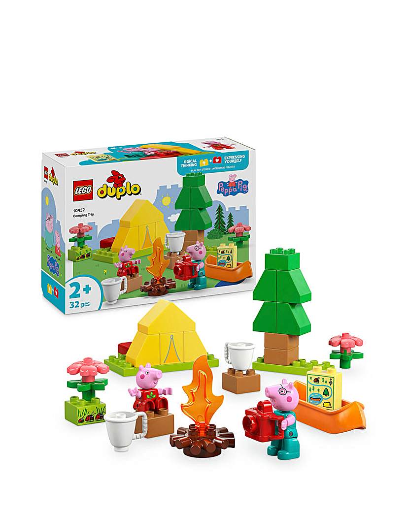 Toddlers embark on a Lego Duplo Peppa Pig adventure with the Camping Trip (10452) building playset. Through creative play, preschoolers explore how they feel about first-time experiences as they make-believe camping with Peppa Pig and Daddy Pig, then explore a river in the toy canoe. This imaginative-play toy for 2-year-olds and over comes with lots of fun accessories. There's a toy tent with 2 sleeping bags, a campfire, 2 mugs and a map to encourage logical thinking as toddlers invent exciting adventures for Peppa and Daddy Pig to take in their canoe toy. Kids practice fine motor skills by building the elements on the toy map. They can spend time in nature, finding ladybirds, and take holiday snaps with the camera toy. This quality Peppa Pig toddler learning toy is a great way to start talking about the emotions preschoolers might feel sleeping under canvas for the first time. These conversations also help build confidence so toddlers begin to feel they too can be as adventurous as Peppa!
