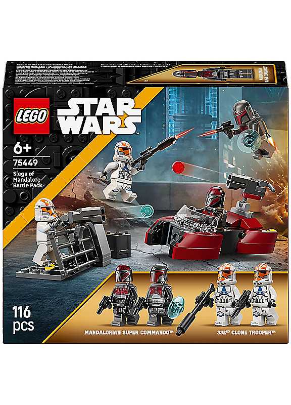 Treat kids to an out-of-this-world Battle Pack (75449) building toy for 6+ year old boys and girls to play out their own version of the Siege of Mandalore from Star Wars: The Clone Wars. This building set features 4 LEGO Star Wars minifigures - 2 Mandalorian Super Commandos and 2 Ahsoka versions of the 332nd Clone Troopers, a Mandalorian speeder toy, the Clone Troopers' barricade and lots of accessories for action-packed play.Activate the speeder's stud-shooting blaster and fire back with the stud shooter mounted on the barricade. Strap on the Commandos' jetpacks for aerial attacks with their blaster pistols. This LEGO Star Wars building toy offers so much to inspire kids' imaginations and makes a fun small gift for 6+ year old boys, girls and any Star Wars fans.Look out for other LEGO Star Wars sets and Battle Packs (sold separately) to add even more play possibilities. Kids can also build with confidence using the LEGO Builder app - zoom, rotate in 3D and track progress with easy-to-follow digital instructions.STAR WARS GIFT - This action-packed building toy provides a fun play and display experience and makes a great birthday gift for 6+ year old boys, girls and fans.Age suitability: 6+ yearsMANDALORIAN TOY FOR 6+ YEAR OLD BOYS & GIRLS - Play out the epic stories from Star Wars: The Clone Wars with this LEGO Star Wars Siege of Mandalore Battle Pack4 LEGO STAR WARS MINIFIGURES - Equip the 2 Mandalorian Super Commandos with 2 jetpacks & 3 blaster pistols, & the 2 332nd Clone Troopers with a blaster & blaster rifleSPEEDER BIKE TOY - Put a Mandalorian Super Commando in the driver's seat of the LEGO Star Wars vehicle & the other at the back with the stud-shooting blasterBUILT FOR ACTION PLAY - Place the Clone Troopers behind the barricade, stow ammo in its storage container, aim & activate the mounted stud shooterSTAR WARS GIFT FOR 6+ BOYS & GIRLS - This building toy makes an great birthday gift for boys, girls & Star Wars: The Clone Wars fans aged 6 years old & upWARNING! Choking hazard. Small parts. | star wars puzzle, star wars board games, lego board games
