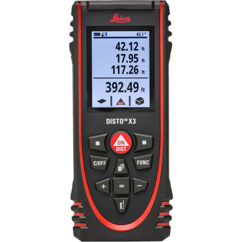 Designed for tough job site conditions, this laser distance measurer is drop-tested from a height of 2m. You can take accurate measurements from corners, grooves, or edges using the multifunctional end piece, which is automatically detected to help prevent expensive measuring errors. Functions such as addition, subtraction, area and volume calculations make any task simple, and the device stores the last 10 results. Data can be transferred error-free via Bluetooth to the DISTO Plan App. * 150m measuring range – suitable for large-scale jobs * High precision – with an impressive accuracy of ±1.0 mm * Robust and durable – drop-tested from a height of 2m * Inclination sensor – for more advanced measuring tasks * Bluetooth connectivity – for error-free data transfer | Leica DISTO Laser Distance Measurer X3 in Black