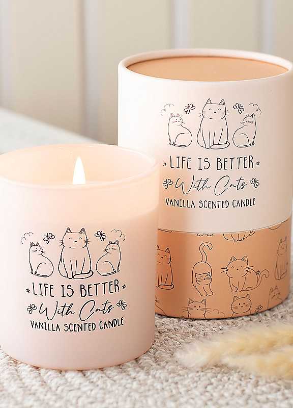 Cosy up with this vanilla-scented candle, housed in a blush pink glass jar with adorable cat illustrations and a matching gift box. A perfect gift for cat lovers.Never leave a lit candle unattendedMade from paraffin waxApprox. 35 hours burn time | scented candles gifts, vanilla scented candles, cat candle, scented candles candles, long lasting scented candles, pet friendly candles