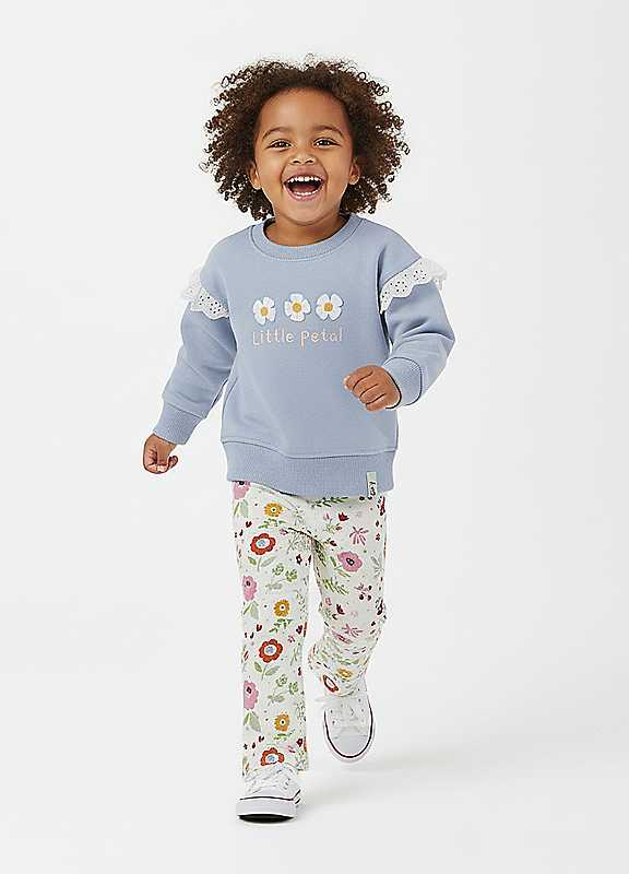 Let their style bloom! Our multicoloured petal print sweatshirt and legging set is bursting with colour, comfort and flower-powered fun.Made from the softest 100% GOTS certified organic cotton, this beautiful 2-piece outfit is perfect for garden wanders, playdates and cosy days indoors. Featuring a joyful petal print sweatshirt in light blue and coordinating multicolour floral flared leggings, it's an easy go-to set for everyday adventures.With a relaxed-fit top and soft elasticated leggings, it's built for play, movement and maximum comfort and of course, it's planet-friendly and gentle on delicate skin.Perfect for little nature-lovers and flower pickers just add sunshine, giggles and a touch of imagination!Machine washable at 30°C100% Cotton