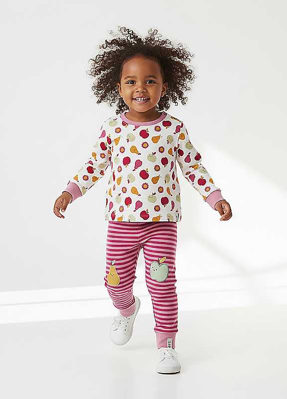 Freshly picked fun! Our apple and pear print top and joggers set is ripe for everyday adventures. Made from the softest 100% GOTS certified organic cotton, this playful 2-piece outfit is perfect for orchard walks, park picnics, and cosy days indoors. The long-sleeved top features our cheerful apple and pear print, paired with comfy striped joggers that are just the thing for wriggling, crawling, and exploring.Soft elasticated waistband ensures a snug and comfy fit, while the breathable fabric keeps little ones happy all day long. Eco-friendly, durable and made for movement it's a go-to outfit with plenty of zest! Perfect for little nature-lovers and snack enthusiasts alike just add giggles and a crunchy apple snack!Machine washable at 30°C100% Cotton