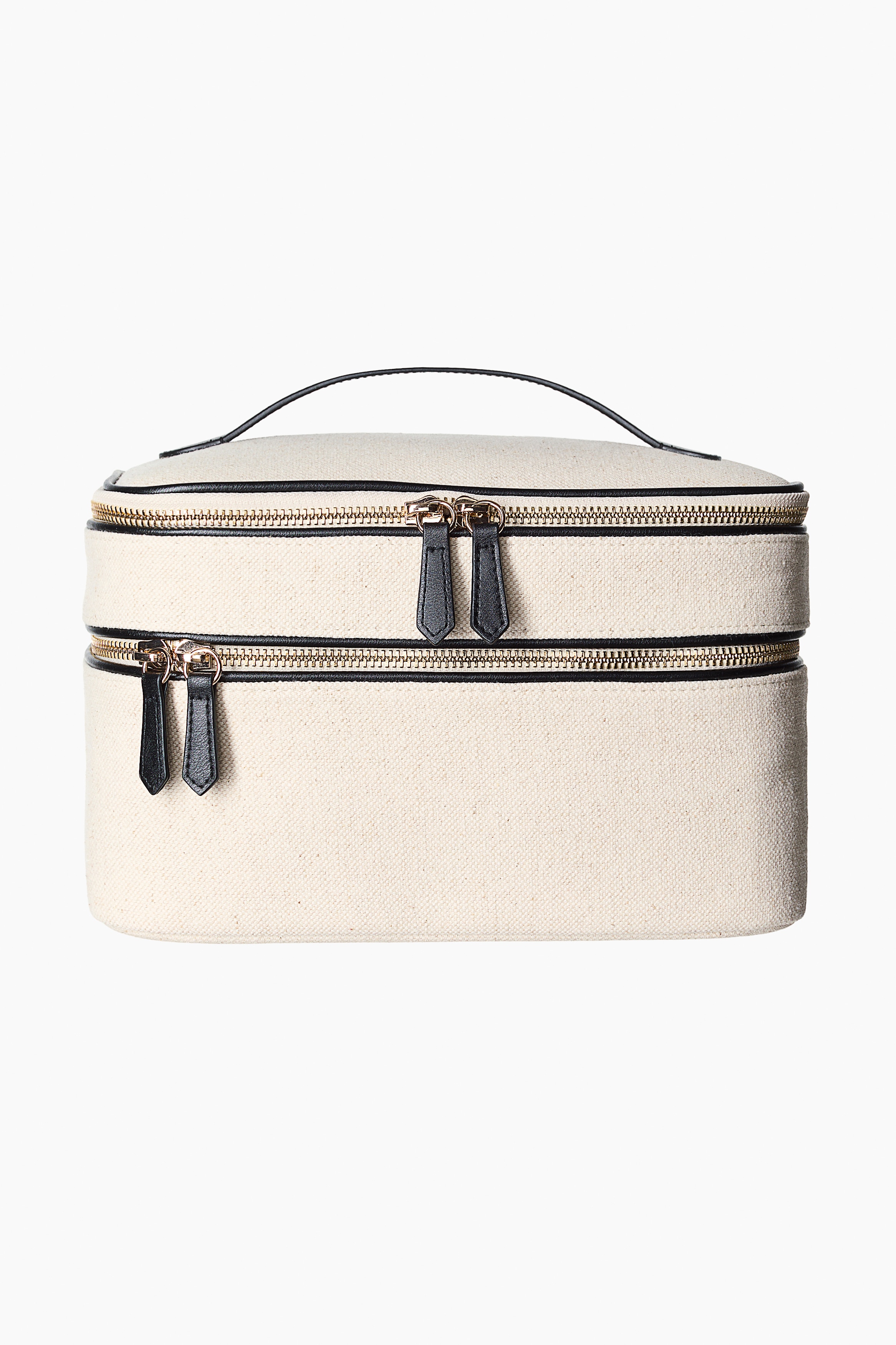 Two-tier wash bag in a rustic linen-blend weave with coated accents. Features a top handle and two large compartments with a two-way zip all around. The lid includes inner storage pockets, ideal for makeup brushes.