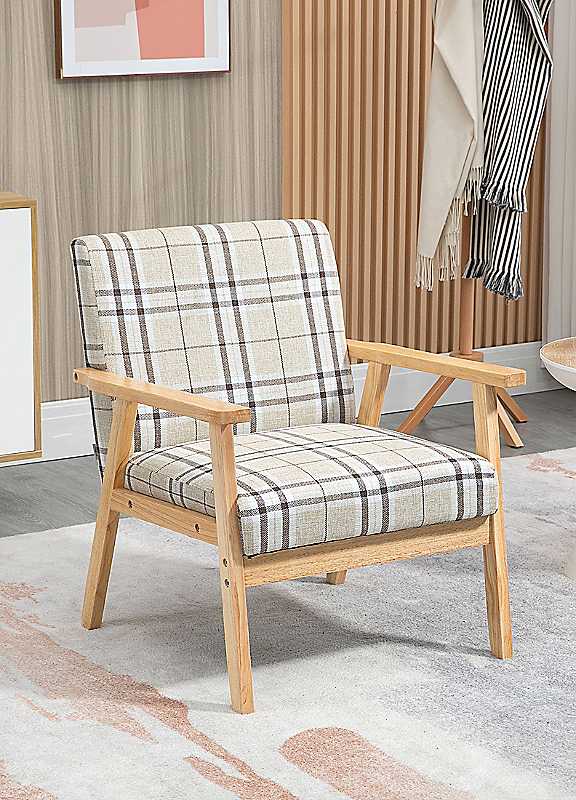 Add standout style and comfort to any room with this bold, checked accent chair. Featuring a bare rubber wood frame and a timeless checked pattern on the padded seat and backrest, this chair is designed to make a statement while offering a cosy spot to relax. The linen-feel fabric is breathable and soft to the touch, while the thick sponge padding ensures a comfortable experience whether you're reading, lounging, or entertaining. Built on a durable rubber wood frame, this chair offers solid support with long-term durability and resistance to cracking. The adjustable foot pads add extra stability on uneven flooring, making it suitable for various spaces in your home. This versatile armchair fits perfectly in your living room, bedroom, study, or dining area, offering both functionality and a touch of mid-century-inspired style. Made with flame-retardant materials for added safety and easy to assemble, it's a stylish and practical addition to any home.Maximum Load: 150 kgBold checked pattern adds visual interest to your spaceBare rubber wood frame provides a stylish contrast and strong supportThickly padded seat and back with breathable linen-feel fabric for everyday comfortAdjustable foot pads ensure stability, even on uneven surfacesIdeal for living rooms, bedrooms, studies, dining rooms, and moreEasy to assemble, made with flame-retardant materials for safetyLinen (100% Polyester), Sponge, Rubber WoodOverall dimensions approx. 77H x 66W x 68D cmSeat dimensions approx. 41H x 56W x 48D cmSeat cushion thickness approx. 13.5 cmBackrest dimensions approx. 40.5H x 55W x 8D cmArmrest height (from floor) approx. 51 cmPlease remember to measure your available space before ordering. If using on an un-carpeted floor we recommend rubber or felt protection pads be used under the legs to avoid damage to your floors. | comfy accent chairs, cozy accent chair, linen accent chair, upholstered accent chair