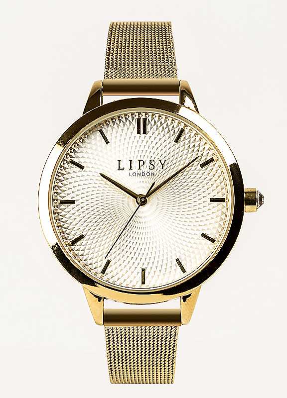 Lipsy Gold Mesh Strap Watch with White Diamond Texture Dial.Brand: Lipsy3 HandsGold Alloy38 Polished caseMineral glass roundWhite diamond texture dialStainless Steel Gold Mesh Strap 3 ATMGold Alloy