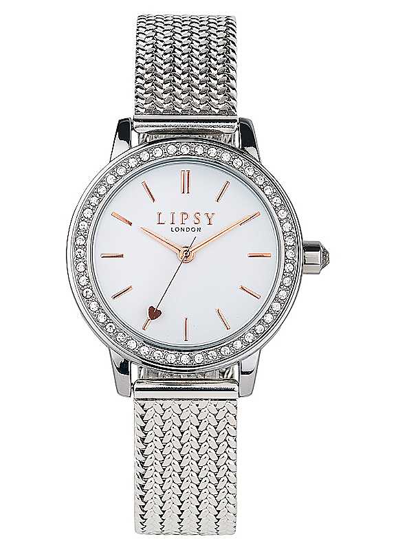 Lipsy Silver Mesh Strap Watch with White Dial & Stone Set Bezel - Size ONE SIZE
