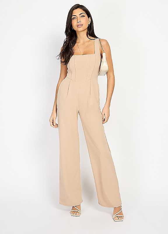 Little Mistress Taupe Wide-Leg Corset Jumpsuit - Beige - Size 16