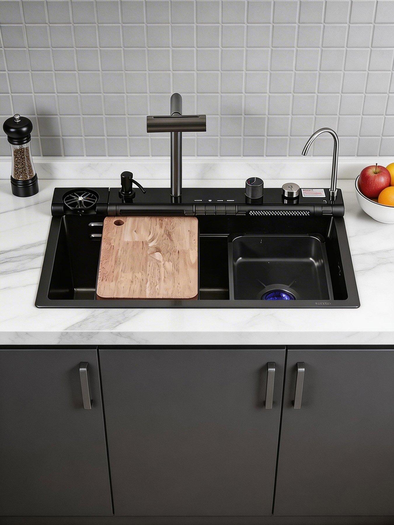 Living And Home Drop In Kitchen Sink With Pull-Out Faucet Elevate Your Kitchen With This Stunning Sink That Beautifully Blends Style And Functionality. The Spacious Deep Bowl Gives You Plenty Of Room, While Two Smaller Colander Inserts Offer Extra Flexibility When Needed. The Adjustable Dual Waterfall Outlet Lets You Switch Between Powerful Jet Spray For Tough Grease And Gentle Flow For Delicate Dishes. A 360° Rotating And Pull-Out Tap With Five Modes, Plus Hot And Cold Temperature Control, Makes Every Task A Breeze. Plus, He Dedicated Drinking Water Tap Adds Convenience To Your Kitchen Routine. This Sink Combines Style And Function To Make Kitchen Chores Effortless And Enjoyable-A Perfect Addition To Any Contemporary Home. Depth: 45 Cm Height: 27 Cm Width: 75 Cm Durable Material: Crafted From Stainless Steel With Nano-Coating, It Is Rust-Proof And Easy To Wipe Clean. Cutting Board Integration: The Cutting Board Slots Into The Sink, Allowing Seamless Preparation And Washing In One Efficient Workflow. Digital Temperature Display: A Clear Digital Screen Shows Real-Time Water Temperature, Giving You Precise Control At A Glance. Convenient Cup Washer: The Handy Cup Washer Quickly Transforms Your Glasses To A Sparkling Clean Finish In Just Seconds. Efficient Drainage System Included: It Is Equipped With A High-Quality Drain Assembly, Ensuring Smooth And Effective Water Drainage. Sink(75Cm W X 45Cm D X 27Cm H). Package Dimensions (Wxdxh): 81 X 50.5 X 27Cm, 14.9Kg