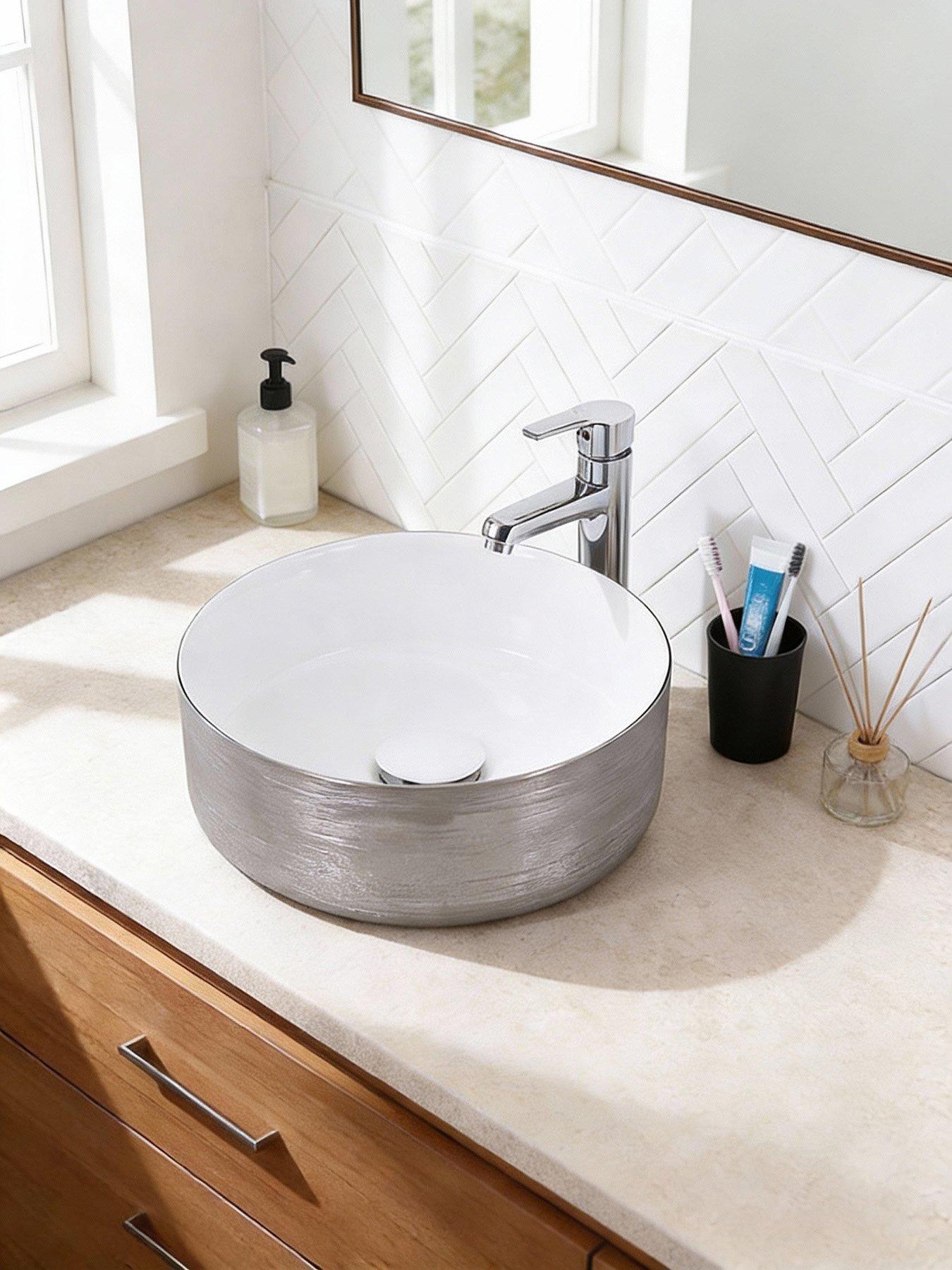 Living And Home Silver Round Ceramic Countertop Washbasin Vessel Sink This Countertop Washbasin Features A Minimalist And Elegant Design That Blends Seamlessly With All Bathroom Styles. Its Smooth Curves And Spacious Washing Area Are Not Only Aesthetically Pleasing But Also Practical, Offering Convenience For Daily Use. The Sloped Design Around The Drain Hole Ensures Quick Water Evacuation, Preventing Accumulation. Equipped With A Drain Set, It Further Aids In Efficient Drainage And Odour Suppression. Moreover, The High-Quality Smooth Surface Makes Cleaning And Maintenance Effortless. It Perfectly Combines Efficient Functionality With A Refined Appearance, Making It An Ideal Choice For Bathroom Upgrades. Depth: 31 Cm Crafted From High-Quality, Scratch-Resistant Ceramic For Long-Lasting Durability And Daily Use. Height: 11 Cm Width: 31 Cm Smooth, Polished Edges Provide A Safe Design That Helps Prevent Accidental Bumps Or Injuries. Includes All Necessary Mounting Hardware For Straightforward And Hassle-Free Vessel Sink Installation. Sleek Round Shape With A Glossy Silver Finish Adds A Modern Touch To Any Bathroom. Premium Electroplated Edge And Stainless Steel Drain Set Ensure A Refined, Complete Look. Dimensions: 31Cm Dia X 11Cm H Washbasin Material: Ceramic Washbasin Edge Processing Technique: Electroplating Drain Hole Diameter: 45 Mm Faucet Included: No