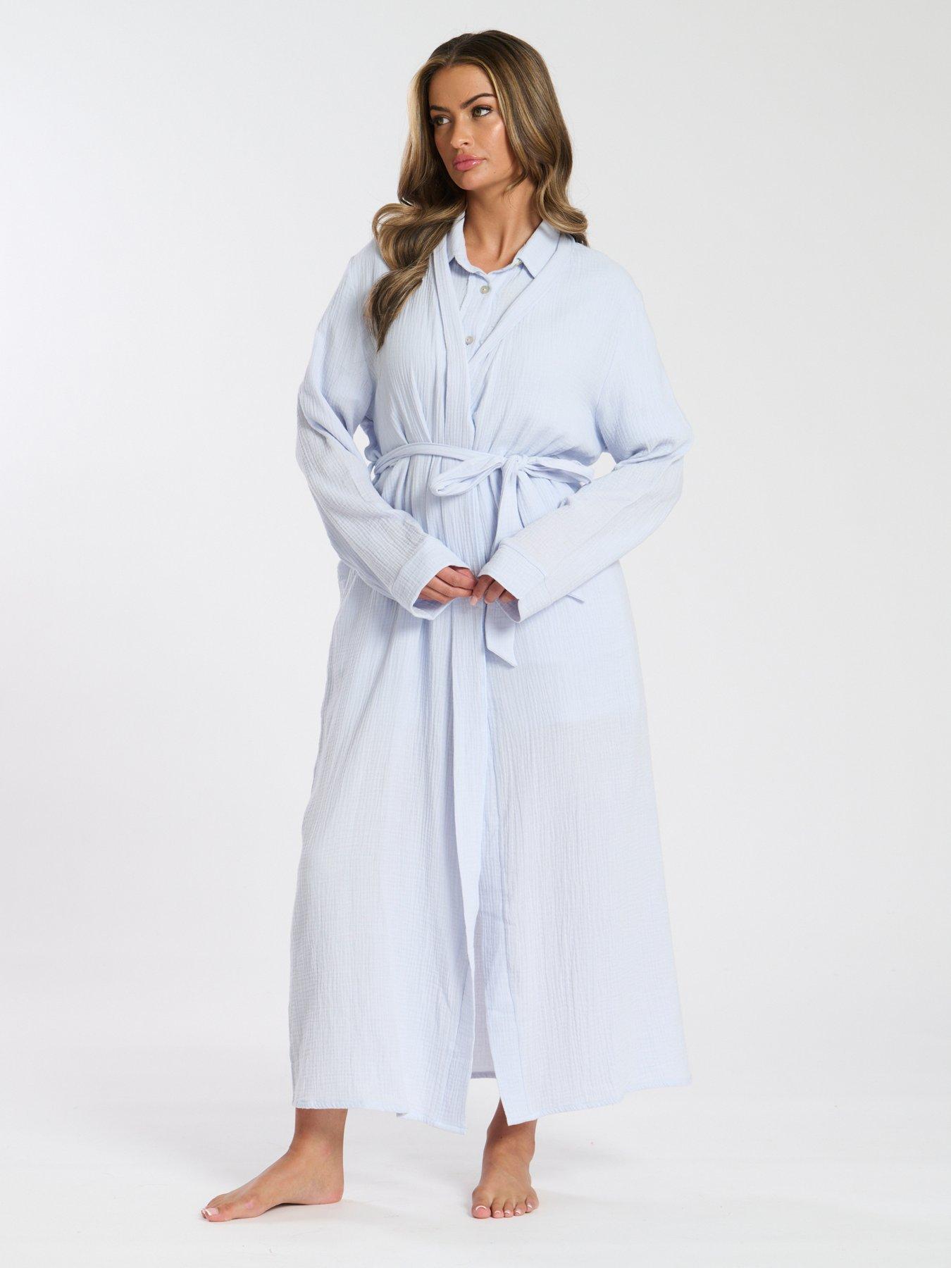 Loungeable Cotton Waffle Robe Size & Fit True to size - order your usual size Available in sizes S - XL Details Cotton Waffle Robe by Loungeable Blue Waffle fabric Long sleeve Tie waist belt Material & Care Material Content: 100% Cotton Washing Instructions: Machine Washable