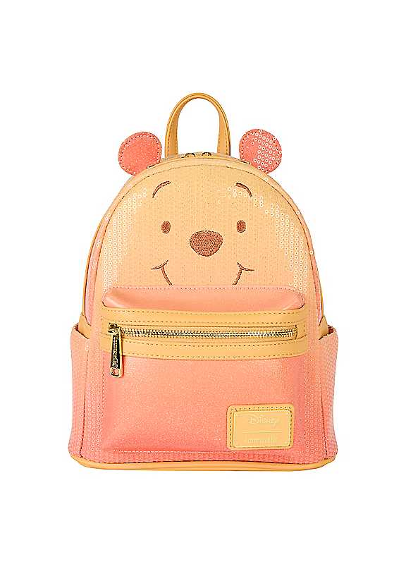 Time to shine with Hundred Acre Wood style!This mini backpack features Winnie the Pooh with embroidered facial details on the front and 3D applique ears. The bag is covered in sequins and the front pocket shines with glitter details. The colours transition from yellow to pink for an ombre effect!Every outfit could use a little sparkle! Add it with one of your favourite characters! Polyurethane Sturdy top handle Adjustable shoulder straps Applique, embroidered, glitter, sequin and printed details Coordinating interior lining Dimensions: 9W x 10.5H x 4.5D in (22.8W x 26.6H x 11.4D cm) This is an officially licensed Disney product | applique tote, colorful backpack, backpack with adjustable straps, mini top handle purse, light pink backpack, mini travel backpack, yellow mini bag, embroidered backpack, mini backpack purse, sequin mini bag, winnie the pooh backpack, cute mini backpacks