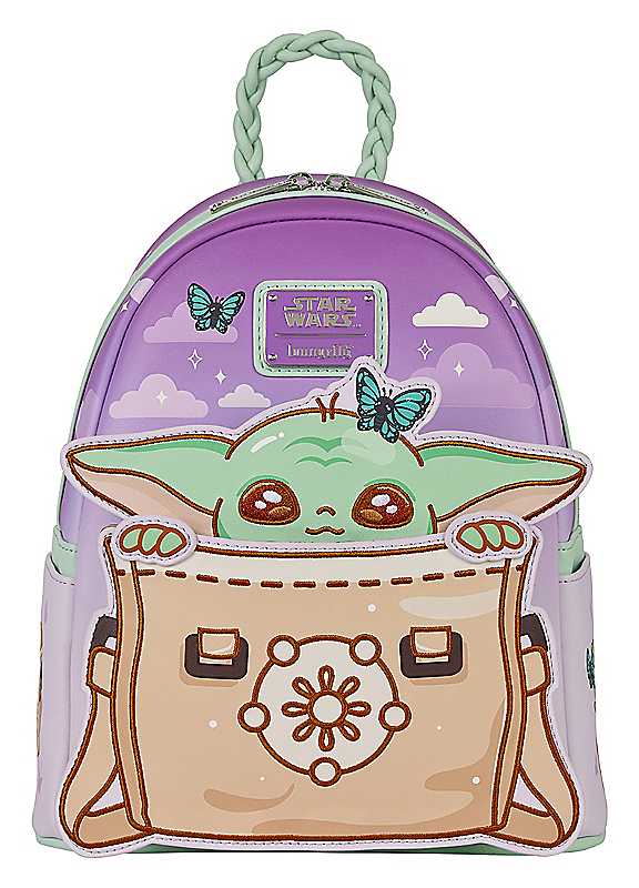 If you love Grogu, this bag is for you! This adorable mini backpack features a hidden pocket behind an applique in the shape of a bag. Grogu pops up from the bag! Behind him is a purple sky with butterflies and clouds. Butterflies are also present on the straps. Find more super cute illustrations of Grogu on the side pockets. This bag is ready to join you on all your adventures throughout the galaxy! Features:Braided top handleAdjustable shoulder strapsGrogu moves up and downApplique, debossed, embroidered, and printed detailsCoordinating interior lining This is an officially licensed Star Wars product.Faux Leather (Polyurethane)Dimensions approx. 22.8W x 26.6H x 11.4D cm (9W x 10.5H x 4.5D ins) | small backpack, faux leather backpack, backpack with straps, butterfly backpack, bag lining, mini backpack, bag zippers, embroidered backpack