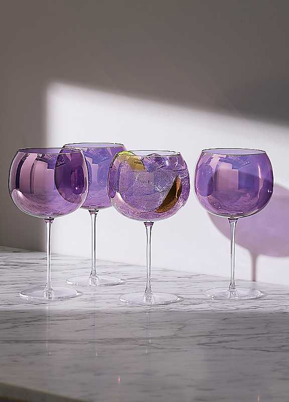 A set of four stemmed balloon shaped glasses handpainted and decorated with iridescent purple lustre. Ideal for wine, spirits and cocktails.Brand: LSAA range of drinkware hand painted glassware with purple lustre, reflecting the incandescent colours of the Northern LightsRecommend Handwashing