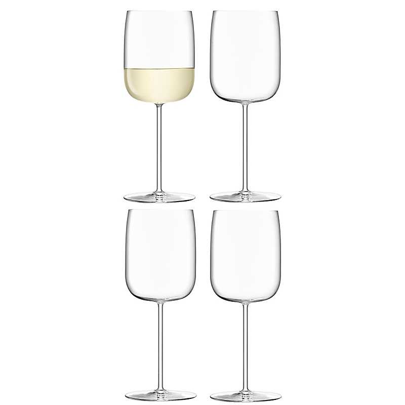 Set of four wine glasses with tall stems. Fine bowls with straight sides which curve towards a flat base. Made from lead-free crystalline glass for clarity and strength. Design and technology combine to complement and simulate handmade processes resulting in stemware featuring cold-cut and fire-polished rims, with finely drawn stems, produced from environmentally friendly lead-free crystalline glass. The quality of the glass guarantees a high level of flex and durability, brilliance and clarity. LSA Glasses Features: Capacity: 380ml Height: 20cm Width: 7.5cm Dishwasher and microwave safe.