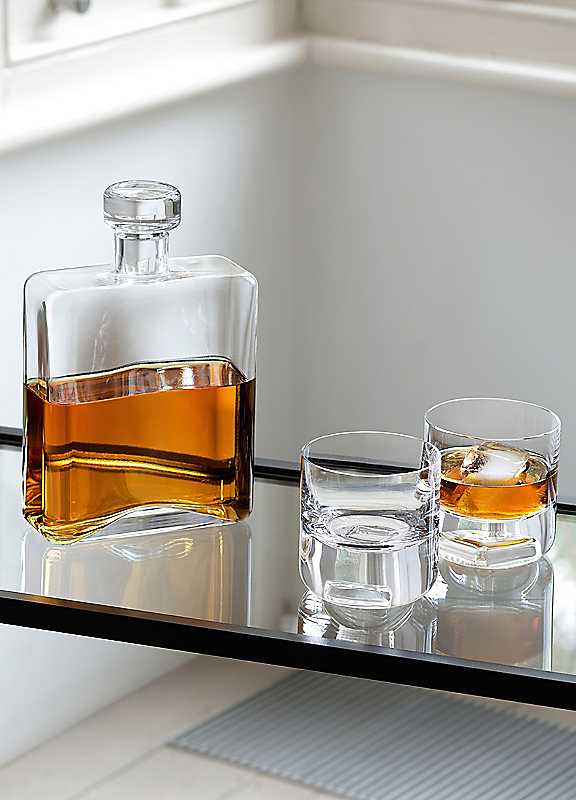A modern, mouth-blown whisky set including pair of heavy hand made glass tumblers and a decanter with oblong shape. For serving whisky and spirits, or as a special gift for whisky drinkers.Capacity: 1 litreLime Soda GlassDimensions approx. 22 x 14 x 6 cm