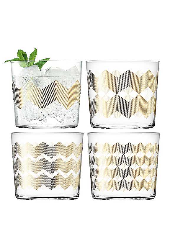 Evocative of Art Deco geometric patterns, assorted gold chevron designs decorate contemporary glass and porcelain shapes. Completing the collection is a mouthblown lantern.Set of 4Capacity: 310mlA range of drinkware, tableware & candleholders featuring assorted gold chevron motifs evocative of 20th century design