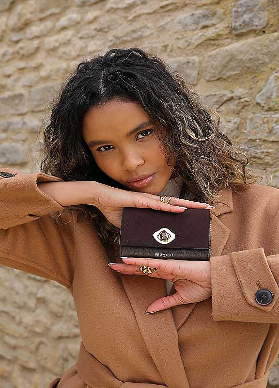 Jenny is a timeless purse featuring the signature maida vale twist lock. With her practical interior, the jenny purse is comprised of four card slots - two sections for notes and a zip compartment for coins. Jenny features a classic suede finish flap, our signature metallic lining and comes complete with a protective dustbag. If you are looking for the perfect bag to match your purse, then bag styles bonnie, oriana, and oriel will complement this purse beautifully.Outer: 70% Polyurethane + 30% PolyesterLining:100% PolyesterH: 10cm, W: 14cm, D: 4cm. | suede wallet, ladies coin purse, women's money purse, dark brown purses, chocolate brown purses, ladies brown wallet, polyester wallet, female purses, ladies purses, metal lined wallet, chocolate brown wallet
