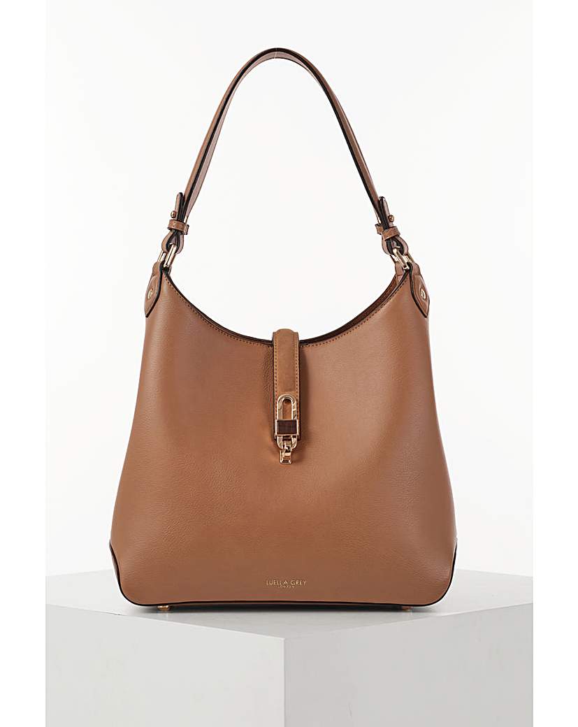 Luella Grey Romany Camel Hobo Tote The Romany Hobo Tote is crafted for effortless style, versatility, and everyday ease. Designed with three spacious compartments, including an extra-large central section, Romany offers plenty of room while keeping essentials beautifully organised. Inside, a secure zipper pocket, a slip-in phone pocket, and a key clip ensure everything stays in its place. Finished with our refined Victoria molten metal twist lock and a resin gemstone detail, Romany blends practicality with signature elegance. Your lovely bag will be delivered to you in our protective branded dust bag. Outer: 90% Polyurethane + 10% Leather. Lining: 100% Polyester. H: 26cm , W: 30cm , D: 15cm, Shoulder Strap Drop 28cm