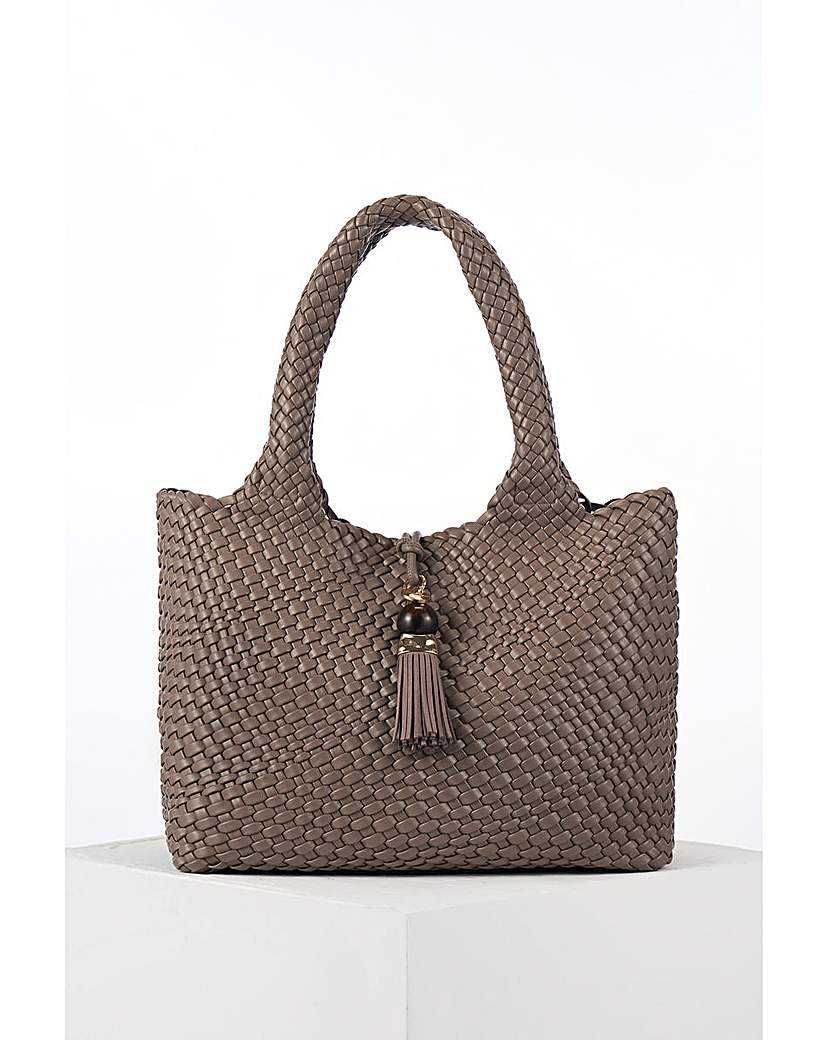Luella Grey Saskia Peat Large Woven Tote The Saskia Tote is beautifully hand-woven, bringing a tactile finish to a timeless silhouette. Chic yet practical, this soft woven tote bag is lightweight, comfortable to wear, and perfectly sized for everyday essentials. With its artisanal weave and effortless style, Saskia is the ideal companion for workdays, weekends, or relaxed summer outings. Internally, Saskia has a removeable '2-in-1' zipper pouch that can be used on it's own or as an internal pouch to keep your belongings secure. This pouch also has two slip-in pockets on the front of it. Saskia arrives in her protective dustbag for when she's not in use. Outer: 100% Polyurethane. Lining: 100% Polyester. H: 29cm , W: 35cm , D: 16cm, Shoulder Strap Drop 25cm