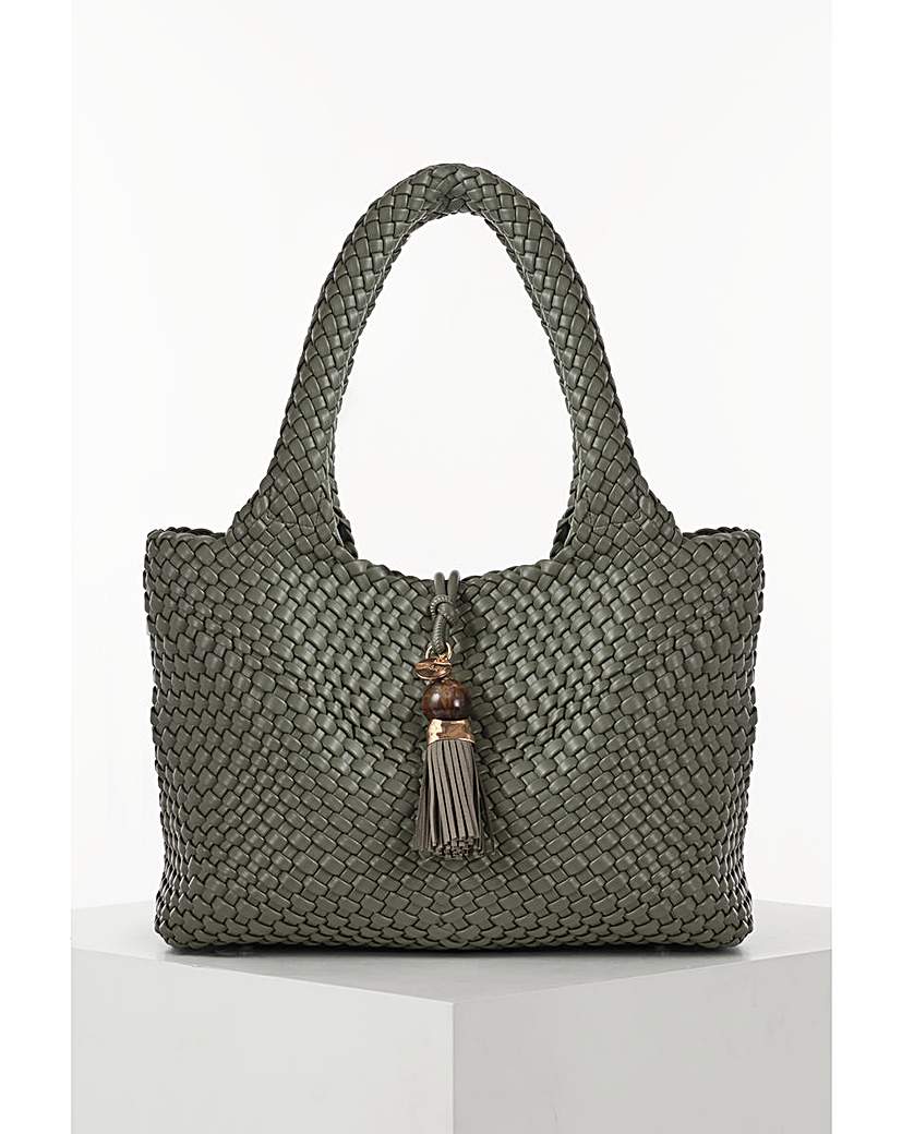 Luella Grey Saskia Khaki Large Woven Tote The Saskia Tote is beautifully hand-woven, bringing a tactile finish to a timeless silhouette. Chic yet practical, this soft woven tote bag is lightweight, comfortable to wear, and perfectly sized for everyday essentials. With its artisanal weave and effortless style, Saskia is the ideal companion for workdays, weekends, or relaxed summer outings. Internally, Saskia has a removeable '2-in-1' zipper pouch that can be used on it's own or as an internal pouch to keep your belongings secure. This pouch also has two slip-in pockets on the front of it. Saskia arrives in her protective dustbag for when she's not in use. Outer: 100% Polyurethane. Lining: 100% Polyester. H: 29cm , W: 35cm , D: 16cm, Shoulder Strap Drop 25cm