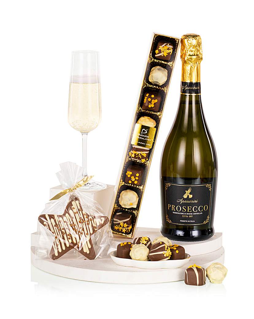 Our Luxury Prosecco & Chocolates gift combines Apasserini Prosecco with Linden Lady Chocolates and a Stas Milk Chocolate Star. Elegantly presented in a ribboned gift bag, its a timeless, sophisticated gift for any celebration. Includes: Linden Lady Assorted Milk & White Chocolates 110g. Stas Chocolatier Decorated Milk Chocolate Star 50g. Prosecco Apasserini Italy 75cl 10.5% vol. Gift Bag. Please note we are unable to deliver this item ROI or Northern Ireland.