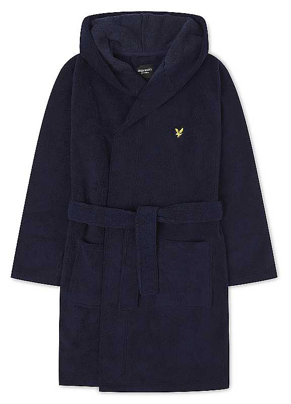 Lyle & Scott Buck boys towelling bath robe. Complete with the classic embroidered eagle. Perfect for any occasion or gifting.Machine washable50% Cotton, 50% PolyesterKeep away from fire. | childrens dressing gown, cotton dressing gown, embroidered bathrobe, polyester robe, bathrobe wrap, towelling dressing gown, bath towel dressing gown, hooded bathrobe, childrens towelling robe, childrens hooded robes, navy blue robe, terry cloth bathrobe
