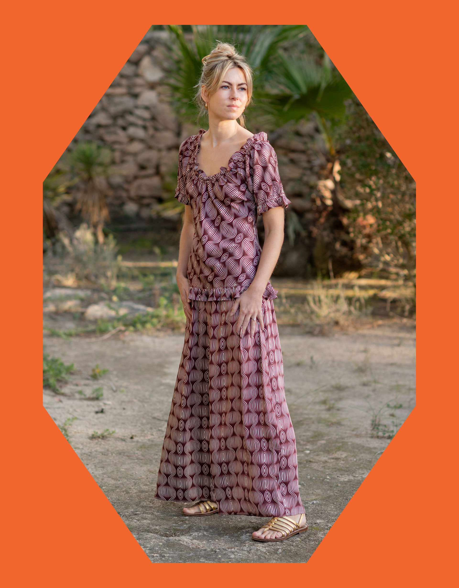 The brand: From sketch to shop floor, Lyrical Sisters lend their ethical, vibrant, and humble inspiration to create beautiful and easy-to-wear collections for work, play, and everything in-between.The product: It's time. Cut in a wide leg profile for extra leg room, these trousers are designed with a retro-inspired print for an artful and contemporary touch. Make it a match and pair these trousers with the Hourglass Print Top.The fabric and fit: Spun in 100% satin. Sizing in-line with Lyrical Sisters. Brown
