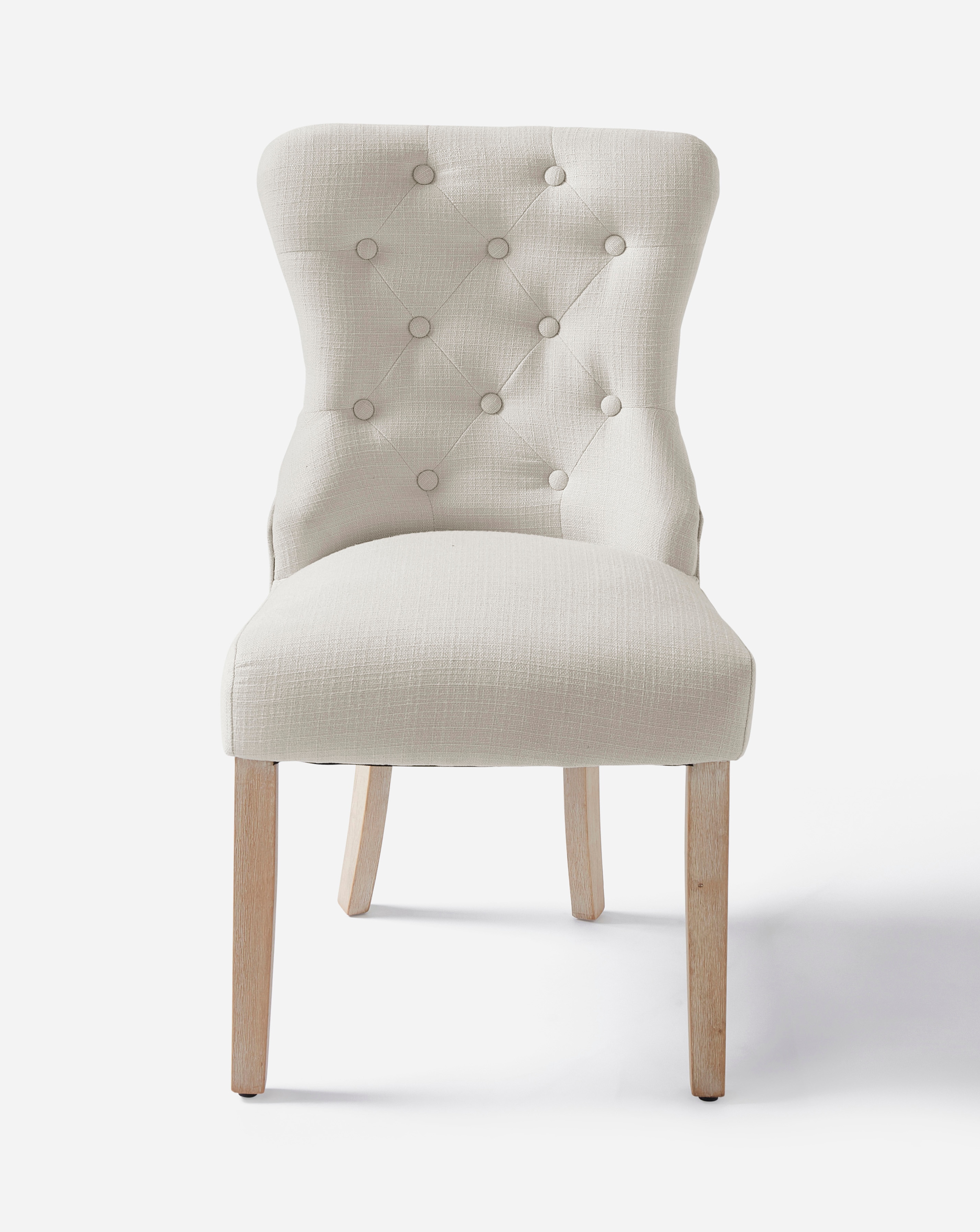 The Mabel Pair of Dining Chairs feature a high button back seat, with wooden legs. Easy build, legs to be fitted.