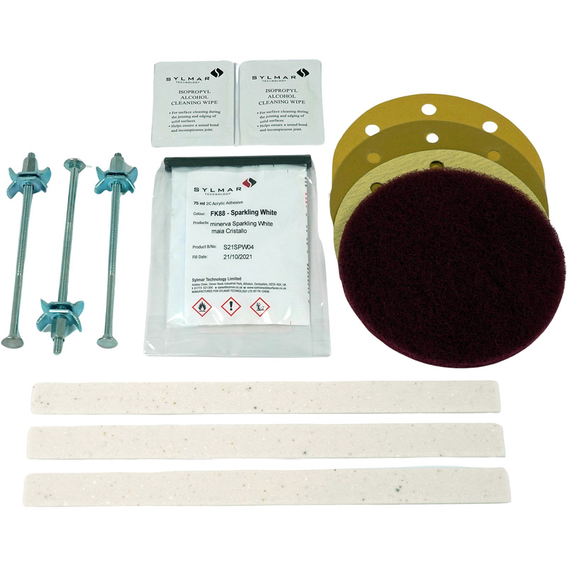 * All materials required for the completion of one maia joint * Provides a seamless and smooth finish * Contains two part adhesive sachet * For Indoor Use * 1x 75ml Adhesive Sachet, 2x Isopropyl Alcohol Wipes, 3x Tongues, 3x Jointing Blocks, Sandpaper (120G, 240g and 320G), Red Abrasive Pad Everything you need for the completion of one Maia worktop joint. The kit includes a 75ml sachet of adhesive with two isopropyl alcohol wipes, three tongues, three jointing bolts, three grades of sandpaper and a red abrasive pad.* Jointing kit for use with Maia Cristallo worktops* All you need for the completion of one joint* Provides a smooth and seamless finish* Includes 75ml sachet of two-part adhesive* Three grades of sandpaper - 120, 240 and 320 grit* Alcohol wipes, jointing bolts, tongues and abrasive pad also included | Maia Worktop Joint Kit in Cristallo | Composite