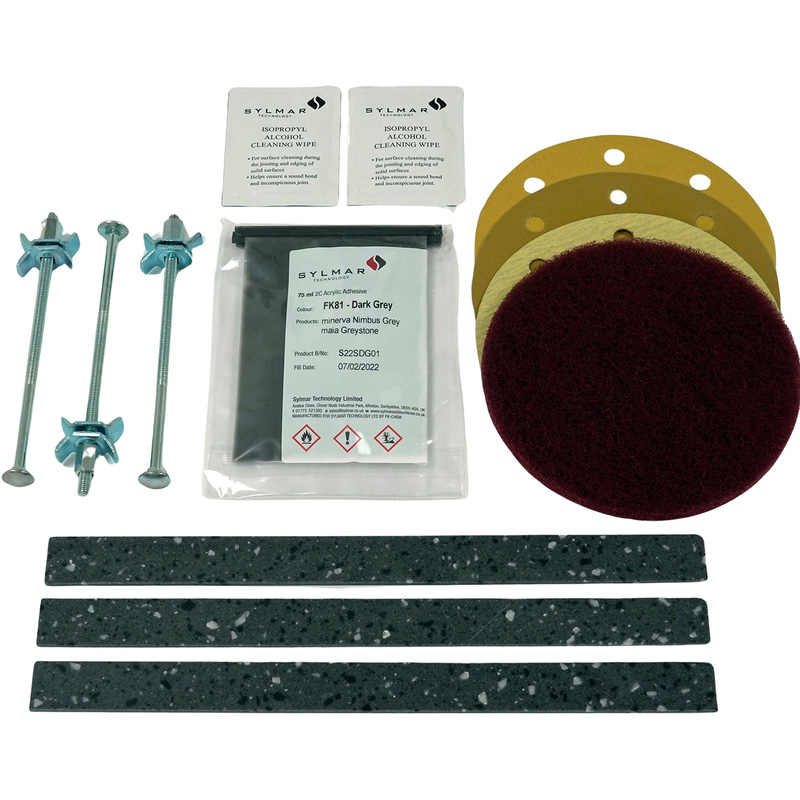 * All materials required for the completion of one maia joint * Provides a seamless and smooth finish * Contains two part adhesive sachet * For Indoor Use * 1x 75ml Adhesive Sachet, 2x Isopropyl Alcohol Wipes, 3x Tongues, 3x Jointing Blocks, Sandpaper (120G, 240g and 320G), Red Abrasive Pad Everything you need for the completion of one Maia worktop joint. The kit includes a 75ml sachet of adhesive with two isopropyl alcohol wipes, three tongues, three jointing bolts, three grades of sandpaper and a red abrasive pad.* Jointing kit for use with Maia Greystone worktops* All you need for the completion of one joint* Provides a smooth and seamless finish* Includes 75ml sachet of two-part adhesive* Three grades of sandpaper - 120, 240 and 320 grit* Alcohol wipes, jointing bolts, tongues and abrasive pad also included | Maia Worktop Jointing Kit in Greystone | Composite