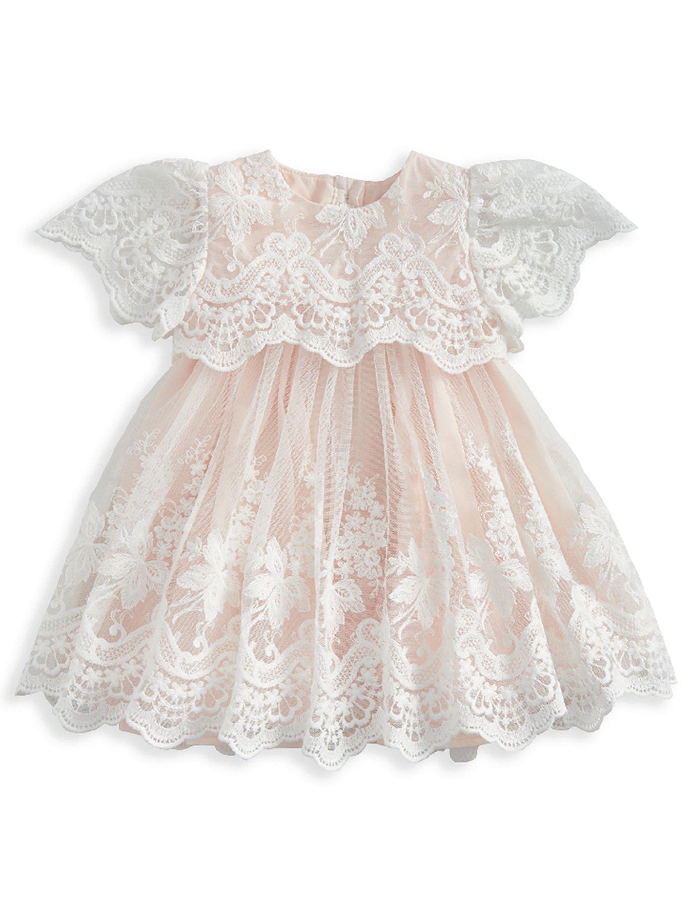 Mamas & Papas Baby Girls Lace Frill Sleeve Dress - Pink A beautifully detailed dress that combines elegance and charm, perfect for special occasions. It features a yoke and gathers attached at the waist for a flattering, structured fit, with a tulle peplum frill lining for fullness and volume. Lace details on the sleeves add a touch of delicacy, while the floating bodice with a delicate scalloped edge enhances the overall design. The back opening is finished with mother-of-pearl buttons for a refined touch. Material Content: Shell: 100% Nylon, Lining: 100% Cotton Washing Instructions: Machine Washable Lace sleeves and scalloped edges add a sophisticated touch Mother of pearl details on back opening Perfect for those dressier occasions