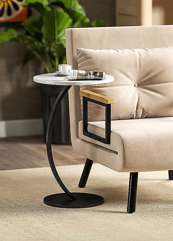 Effortlessly stylish and space-saving, this C-shaped side table is designed to elevate any living room, bedroom, or home office. Features a sleek white marble-effect surface that adds a sophisticated touch to your space while being easy to clean and scratch-resistant. Slides smoothly under sofas or beds, maximizing your living area and keeping essentials close at hand. Constructed with a powder-coated metal frame and melamine-coated particleboard for enhanced strength, balance, and longevity. Ideal as a sofa side table, bedside table, or decorative accent-perfect for drinks, books, or d©cor.Weight capacity: 10 kgAssembly RequiredWhite marble effect adds elegance to any roomStylish C-shaped silhouette complements modern decorSlides under sofa to save space effectivelyPowder-coated frame for enhanced strength and balanceScratch-resistant surface ensures easy maintenanceItem Label: 83B-379V00WTParticleboard, MetalOverall size approx. 40 x 61.5H cmTabletop thickness approx. 1.5 cmBase diameter approx.: 30 cmPlease remember to measure your available space before ordering. If using on an un-carpeted floor we recommend rubber or felt protection pads be used under the legs to avoid damage to your floors.