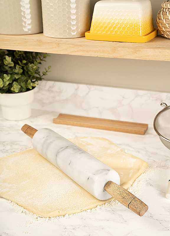 The Kitchen Pantry Marble Rolling Pin with Stand is ideal for rolling perfectly smooth pastry and doughs in the home kitchen. The wooden-handled pin is finished with brass detailing that adds a modern touch to any kitchen. And the stand etched with measurements helps make it simple to roll out to the right size.The heavyweight smooth marble allows an easy and even roll every time and helps to keep pastry, doughs and icing cool enough to roll without cracks. And as it doesn't absorb odours it's a versatile addition to any kitchen. Simply hand wash in warm soapy water after use.Part of the Kitchen Pantry range - innovative products designed in the UK that help home bakers to create, bake and preserve wonderful things in the kitchen.Acacia / Marble