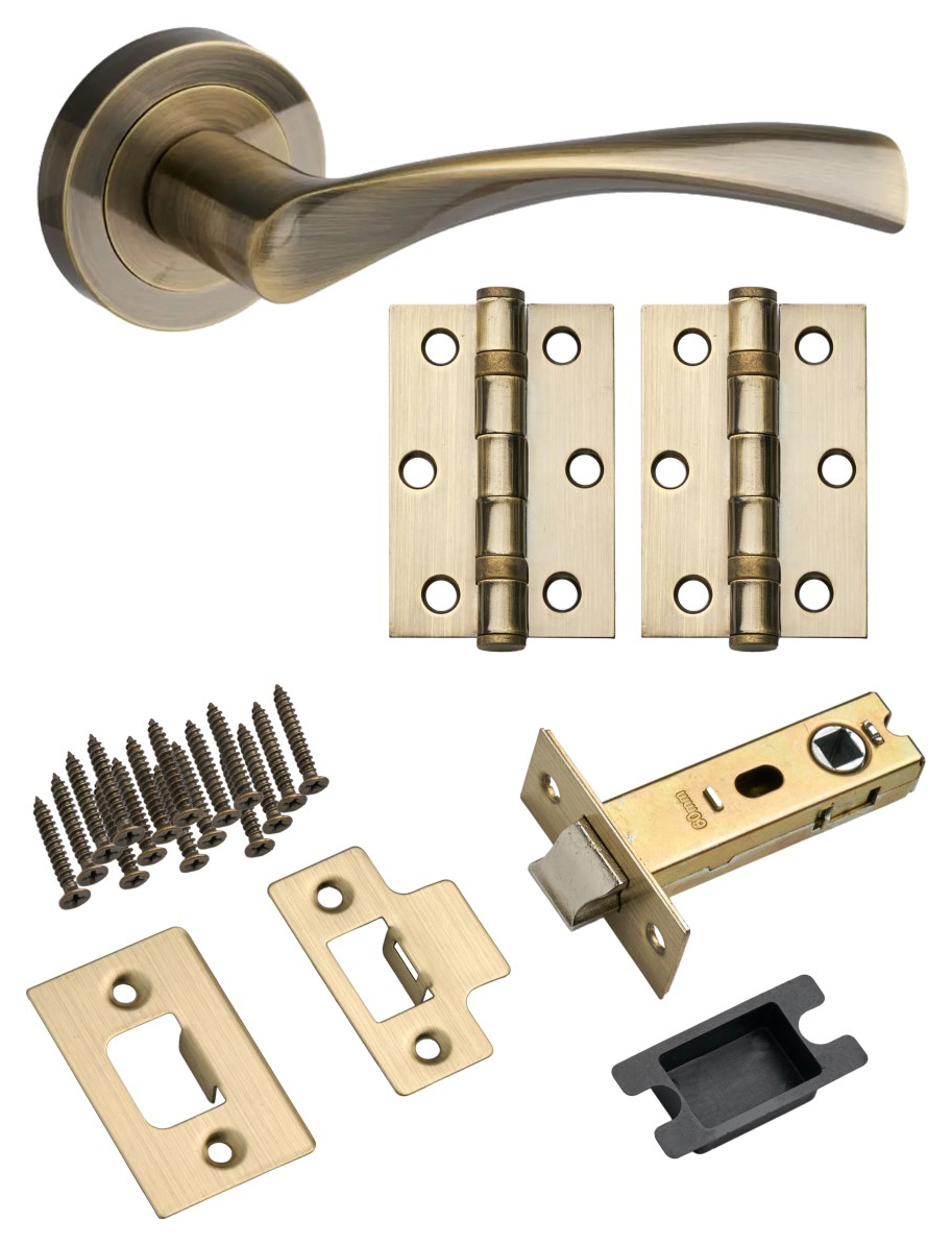 Marvel Lever on Rose Antique Brass Latch Hinge Pack - This handle pack includes a pair of handles, tubular latch, pair of sturdy ball bearing hinges, and all the screws for a straightforward installation.