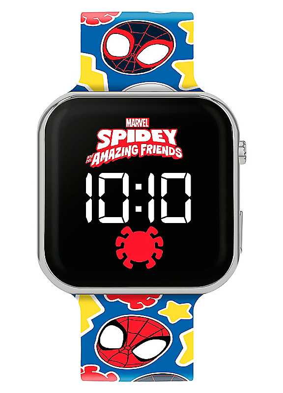 Spidey and His Amazing Friends LED Watch featuring a Spidey and friends dial design, silver plastic casing, digital light up display and fun printed strap design with traditional buckle fastening. Packaged in official branded packaging and comes with one year guarantee.Printed strap designSpidey & friends dial designDigital light up displaySilicone | silver and blue watch, rectangle shape watch, red and blue watch, super hero watch, cartoon wrist watch, spider man watch, silicone strap watch, led digital watch, silver digital watch, strap buckle watch, silver rectangle watch